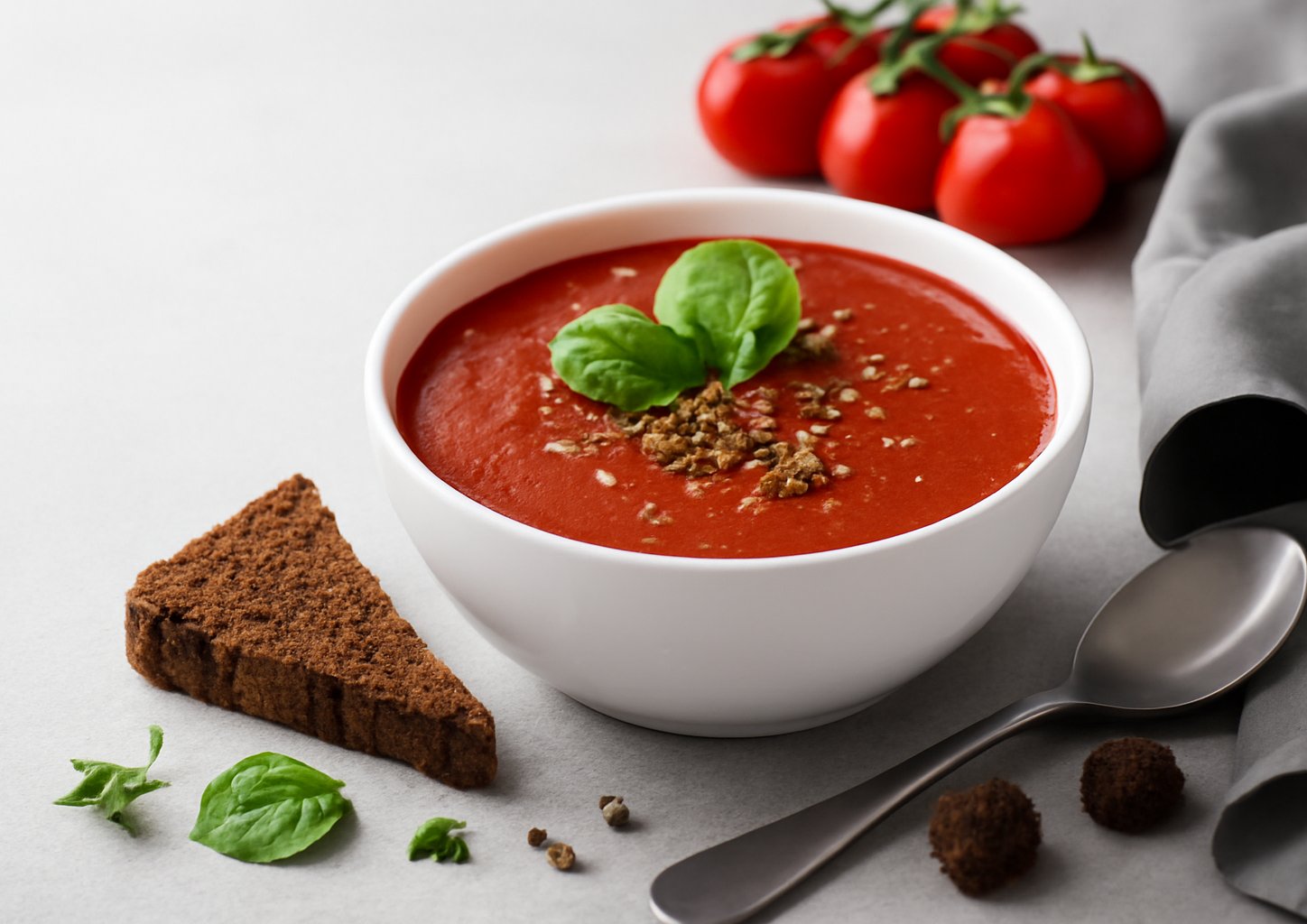 После того, как помидоры полностью проварятся, бросьте в суп предварительно измельчённый чеснок и базилик. Добавьте соль и перец.Шаг 6