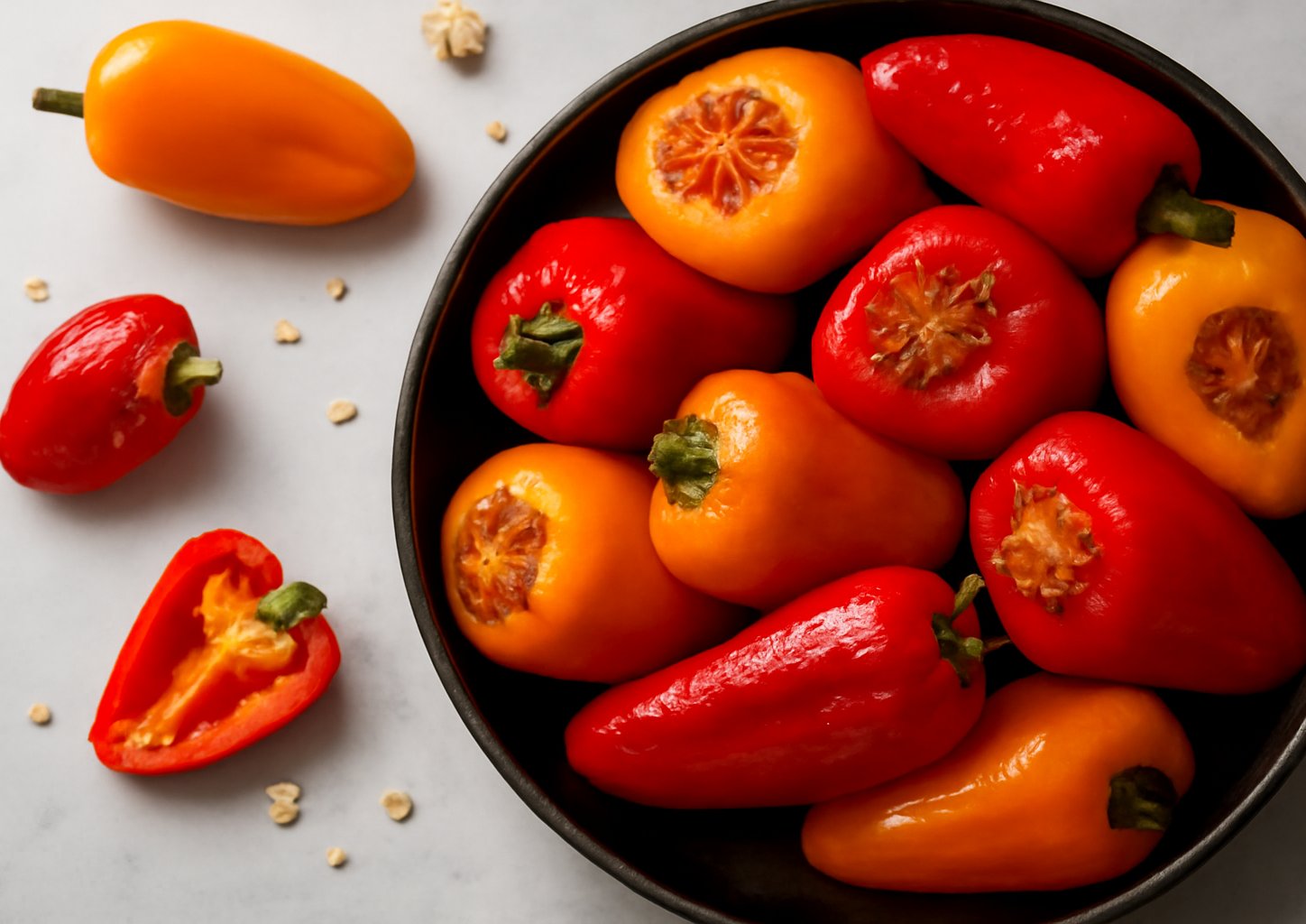 Плотно накройте фольгой форму с перцами и поставьте в нагретую до 200°С мини-печь на 1 час. Через час запекания снимите фольгу и оставьте в печи ещё на 20 минут. Приятного аппетита!