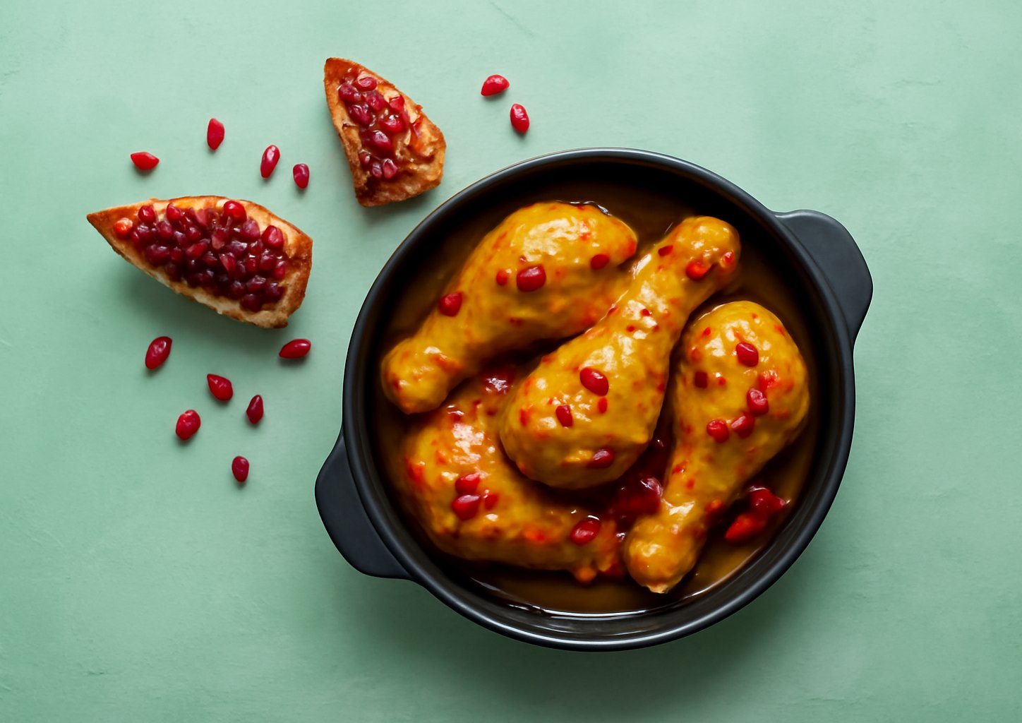 Куриные голени промойте и замаринуйте в гранатовом соусе. Оставьте мясо мариноваться на 1 час.